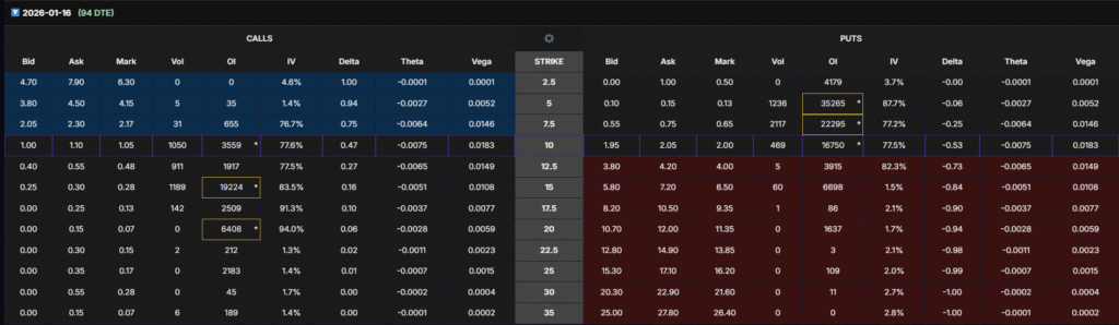 - Jan 16, 2026 (94 DTE): Institutional accumulation at $15 and $20 calls.