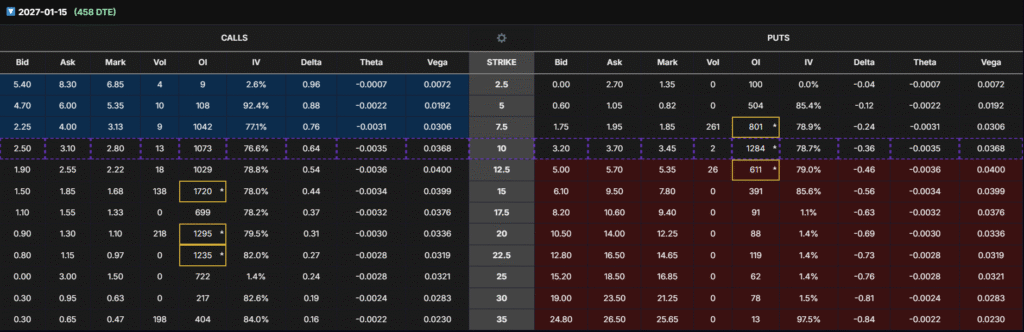 - Jan 15, 2027 (458 DTE): Clear dominance at $15 Call (OI 1,720) — matching ideal delta and vega balance.