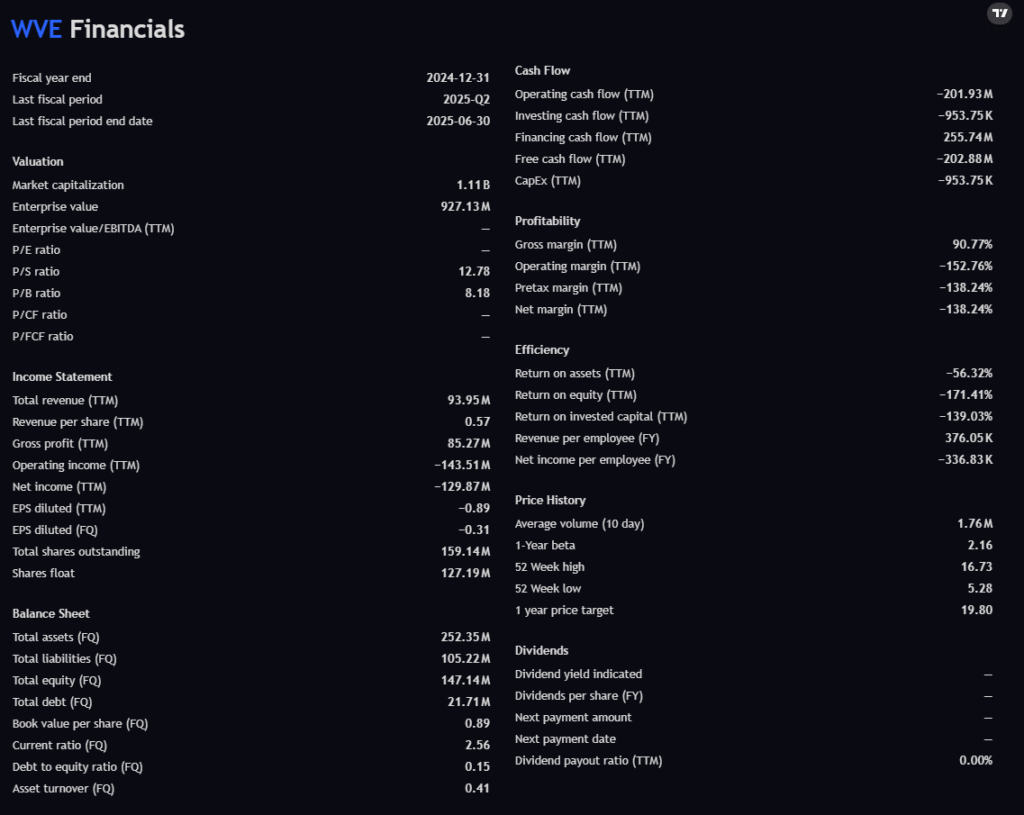 In short: WVE has financial runway thanks to low debt and liquidity, but remains a speculative, cash-burning biotech where catalysts matter more than fundamentals.