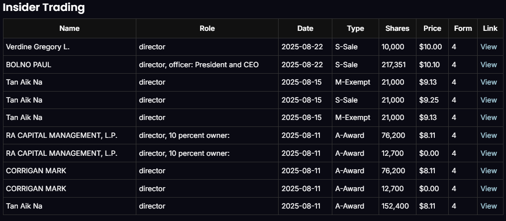 Interpretation: Insiders took profits into strength at $9–10, meaning that level will likely act as resistance. But institutional conviction (RA Capital) supports the bull case longer term.