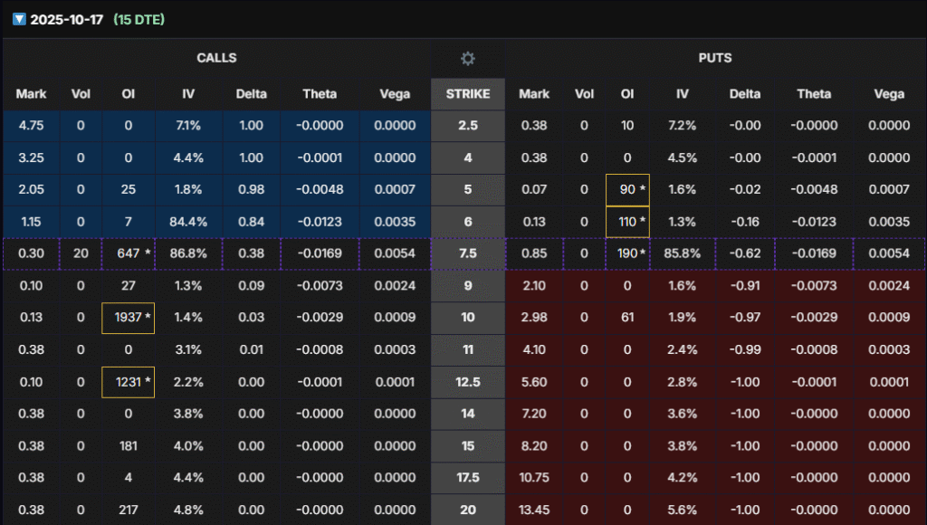 - Oct/Nov expirations show clustering around $10 calls.