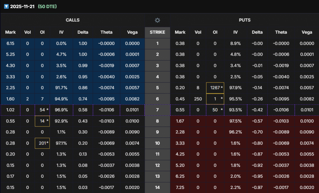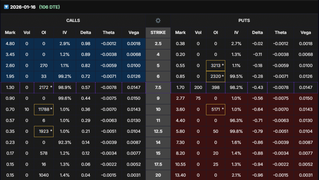 - Jan 2026 has enormous OI (11.7k contracts) at $10C.