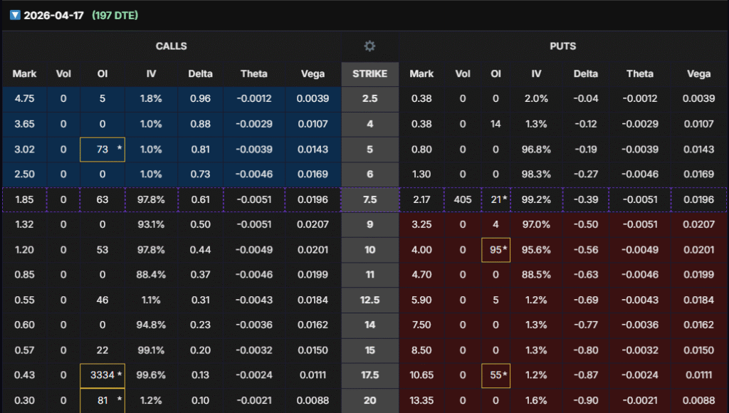 - April 2026 (197 DTE): The standout is the $17.5C with OI 3334, Delta 0.13, and Vega 0.0198 — the highest Vega among OTM calls.