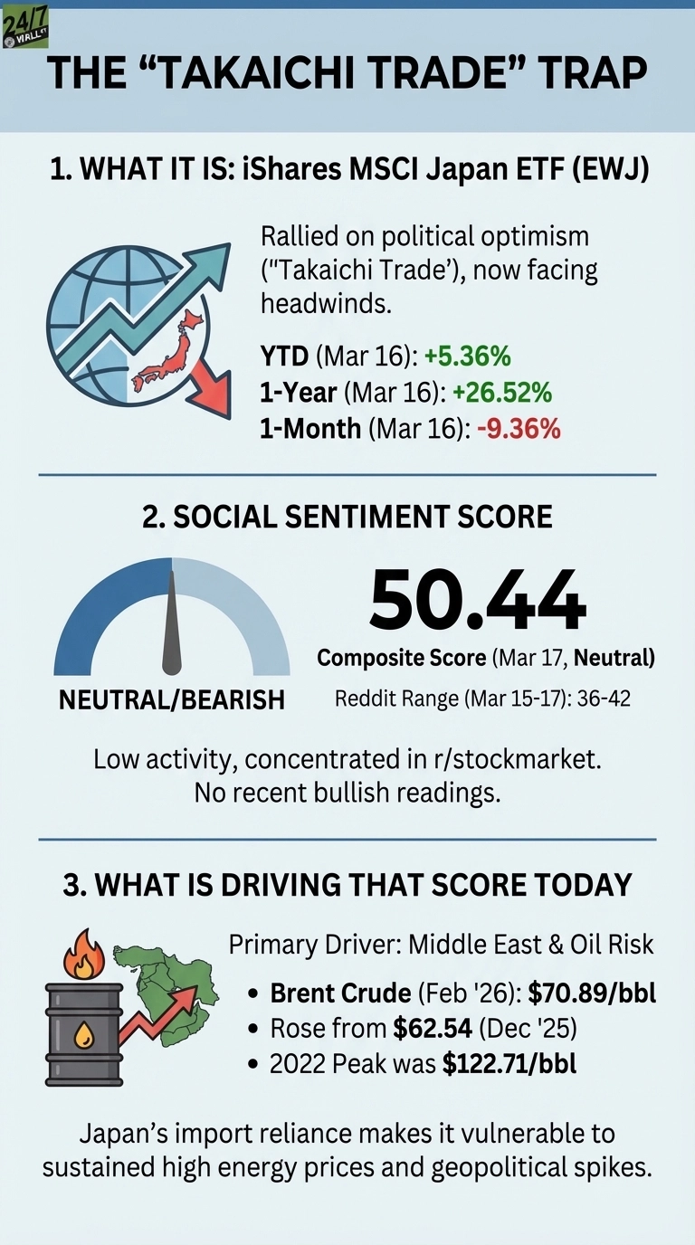 Providing investors with access to the Japanese stock market in a single trade, the iShares MSCI Japan ETF (NYSEARCA:EWJ) was one of the best-performing developed-market funds through early 2026, riding political optimism traders dubbed the "Takaichi trade." That run has hit a wall. EWJ is down 9% over the past month, even as it holds... Japan's Best ETF Trade of 2026 Is Down 9% in a Month and Oil Is Just Getting…